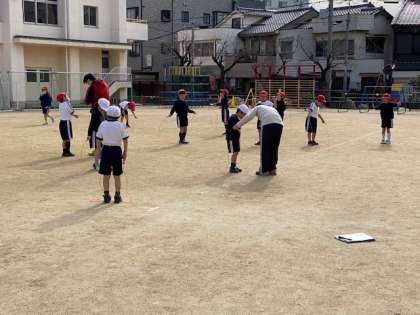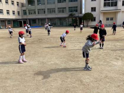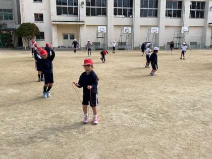 本日2時間目、1年生1・2組の授業のようすです。合同体育で、運動場でなわとびの練習をしています。