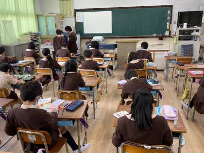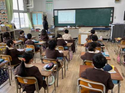 本日2時間目、2年生1・2組の授業のようすです。どちらも算数で、「はこの形のへんやちょう点についてしらべましょう。」ということで、自分たちで作った箱について調べています。