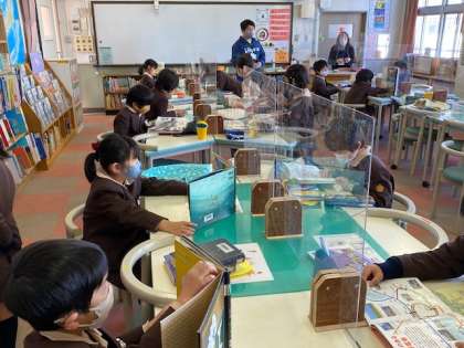 本日2時間目、1年生1・2組の授業のようすです。1組は図書の時間で、図書館で本を読んでいます。2組は算数で、「時計」の学習をしています。