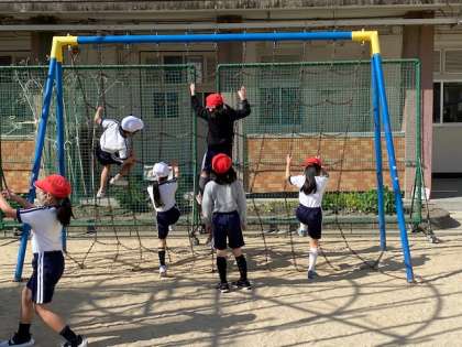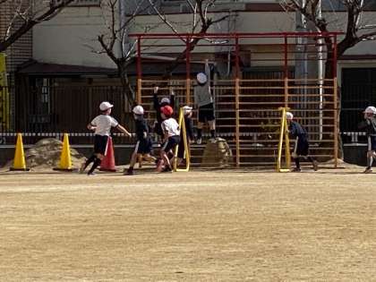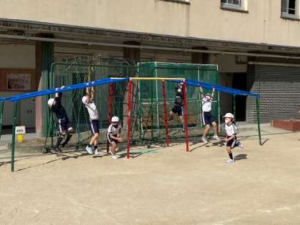 本日5時間目、2年生1・2組の授業のようすです。合同体育で、うんてい・鉄棒・ろくぼく等のさまざまな遊具をサーキット運動のように回っています。