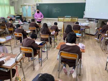 本日2時間目、3年生1・2組の授業のようすです。1組は算数で、そろばんの学習をしています。2組は国語で、プリント学習をしています。