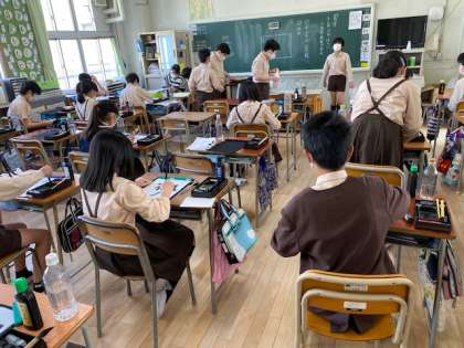 本日2時間目、6年生1・2組の授業のようすです。どちらも書写で、最後の時間なので「好きな漢字」を一字書いて貼りだしています。