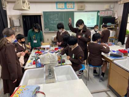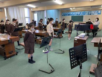 本日2時間目、5年生1・2組の授業のようすです。1組は音楽で、音楽室で歌の練習をしています。2組は理科で、教材キットを使ってコイルを制作しています。