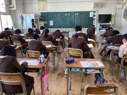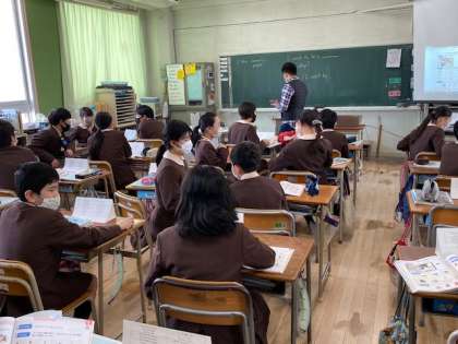 本日3時間目、6年生1・2組の授業のようすです。1組は英語で、なりたい職業についてお互いに英語で伝え合っています。2組は国語で自習をしています。