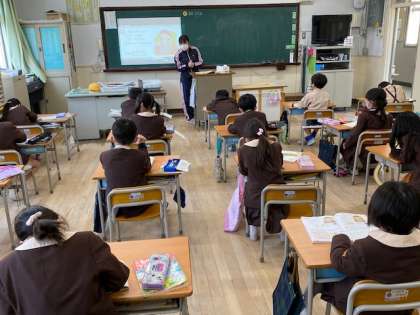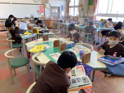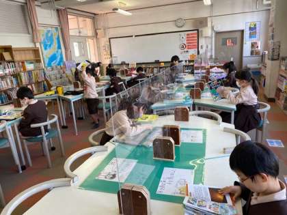 本日2時間目、1年生1・2組の授業のようすです。1組は図書の時間で、図書館で本を読んでいます。2組は算数で、「100までの数の足し算」をしています。
