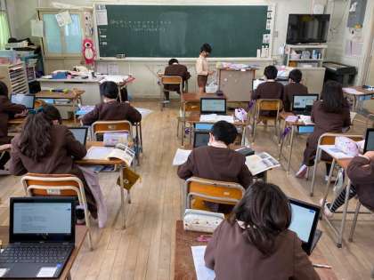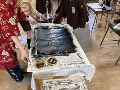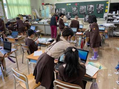 本日2時間目、3年生1・2組の授業のようすです。どちらも図工で、紙をちぎって貼り絵をして作った「なわとびをしている人」で版画をしています。できあがった人はタブレットを使って自習をしています。