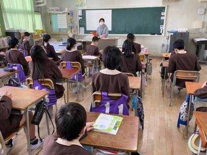 本日2時間目、5年生1・2組の授業のようすです。1組は理科で、教材キットで作った電磁石を使って性質を調べようとしています。2組は社会で、「わたしたちの生活と森林」について学習しています。