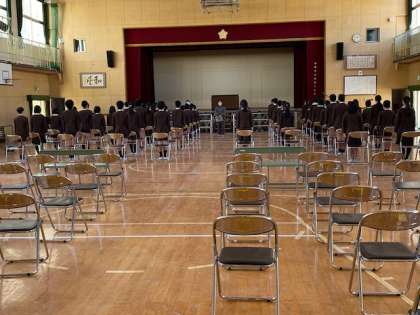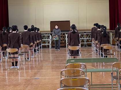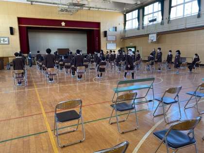 本日2時間目、6年生1・2組の授業のようすです。講堂で、卒業式の練習をしています。「別れのことば」や退場等の練習をしています。