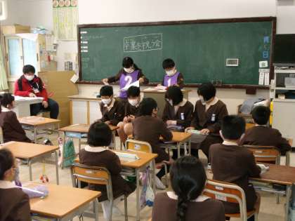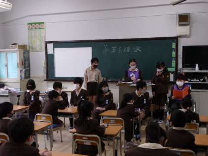3月5日(金)、児童会行事「卒業を祝う会」が行われました。感染症予防のため今年度は、講堂ではなく各たてわり班ごとに教室に集まって行われました。一年間の感謝の気持ちを込めて5年生の代表がメッセージを送ったり、班全員でゲームをしたりしました。
