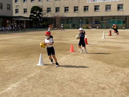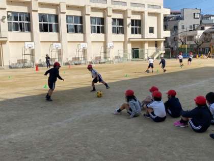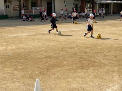 本日5時間目、2年生1・2組の授業のようすです。合同体育で、サッカーボールを持って走ったり、ドリブル・パスの練習をしたりしています。