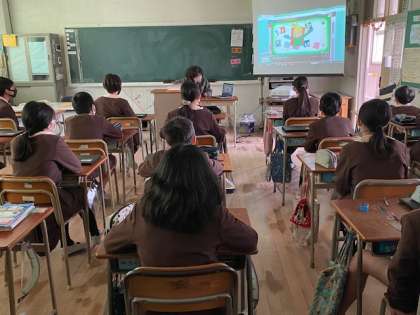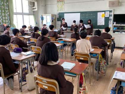 本日4時間目、6年生1・2組の授業のようすです。どちらも英語で、1組はビデオ教材を鑑賞していて、2組はなりたい職業や入りたいクラブ等について、前に出て英語で発表しています。