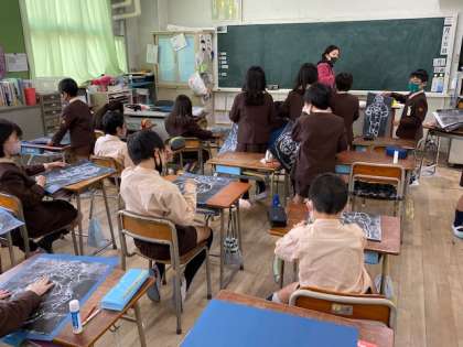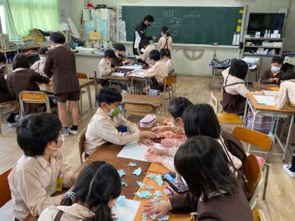 本日3時間目、3年生1・2組の授業のようすです。どちらも学活で、1組は卒業祝いの掲示物を作っていて、2組は紙をちぎって貼り絵をして作った「なわとびをしている人」の版画を集めています。