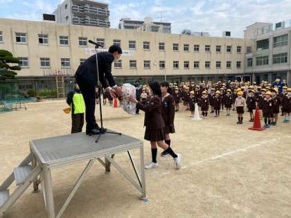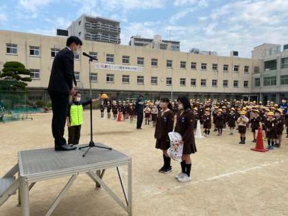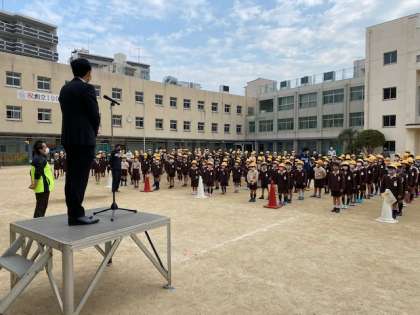 本日の児童朝会では、大阪信用金庫よりバスケットボール2個の寄贈があり、西淀支店長様から児童代表へ渡していただきました。その後、児童代表のお礼の言葉と支店長様からのお話がありました。