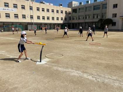 本日2時間目、4年生1・2組の授業のようすです。1組は体育で、ティーベースボールの練習および試合をしています。2組は図工で、版画を刷っています。