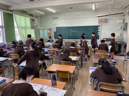 本日2時間目、5年生1・2組の授業のようすです。どちらも学活で、クラス目標を決めたり、個人目標をプリントに書いたりしています。