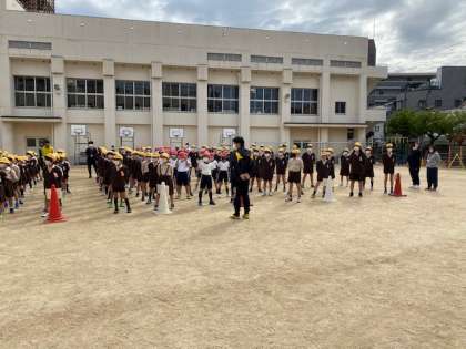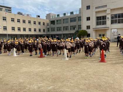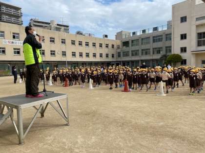 本日朝、1年生から6年生まで全員そろって初めての児童朝会がありました。
