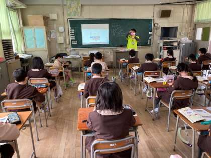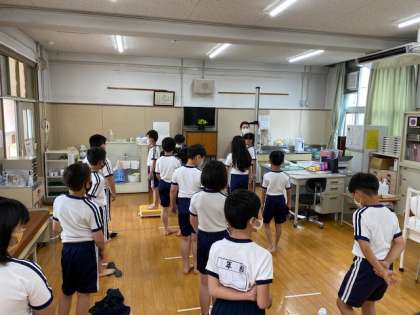 本日2時間目、4年生1・2組の授業のようすです。1組は算数で、「角とその大きさ」の単元で、色紙を使って扇を作っています。2組は、保健室で発育測定をしています。
