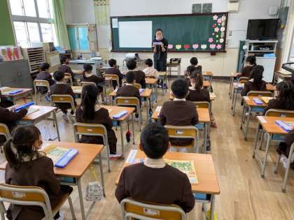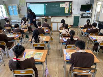 本日2時間目、1年生1・2組の授業のようすです。どちらも算数で、算数ブロックを初めて使っています。