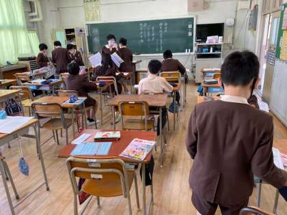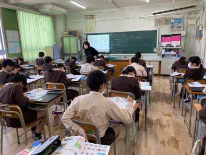 本日2時間目、6年生1・2組の授業のようすです。1組は社会で、「憲法の基本的人権の考え方」について学習しています。2組は保健室で視力検査をしながら、教室で自習をしています。