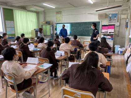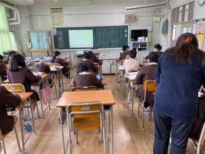 本日2時間目、6年生1・2組の授業のようすです。1組は英語で、C-NETのマーク先生が、自分の出身の英国のことを紹介しています。2組は道徳で、「スポーツの力」について考えて作文をしています。