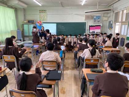 本日3時間目、1年生2組のようすです。給食が始まってしばらくの間、6年1組のお兄さん・お姉さんに給食を運んでもらっていたので、そのお礼と北校舎3階の探検を兼ねて6年1組にやってきました。お礼にみんなで作ったものを渡しました。