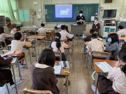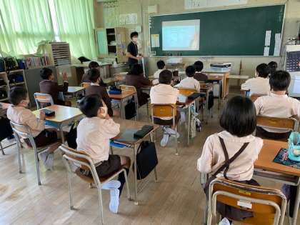 本日3時間目、4年生1・2組の授業のようすです。1組は国語で、「国語辞典の使い方」のプリントをしています。2組は算数で、ビデオ教材を使ってグラフの学習をしています。