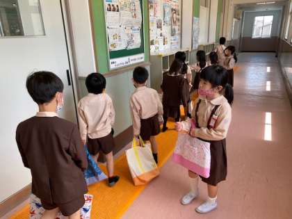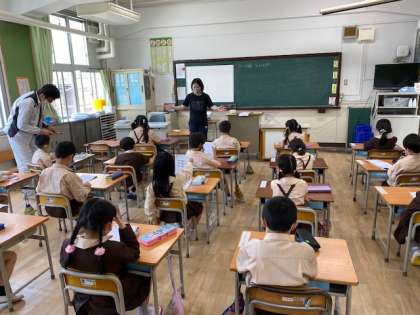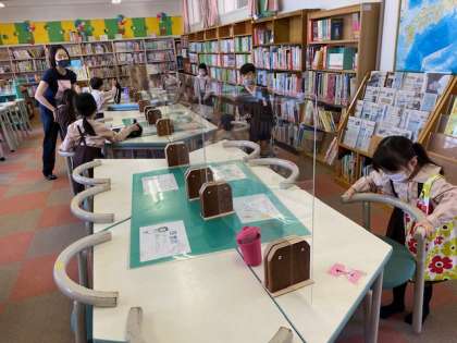 1年生1・2組の授業のようすです。1組は算数で、「なんばんめ」の学習をしています。2組は図書館で本を借りています。