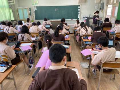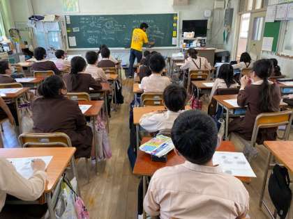 5年生1・2組の授業のようすです。1組は算数の「直方体や立方体の体積」の学習をしています。2組は音楽のリコーダーの練習を家でしてもらうために、準備をしています。