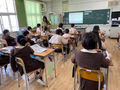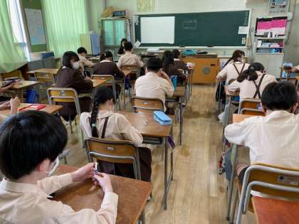 6年生1・2組の授業のようすです。1組はたてわり班の自己紹介カードを記入しています。2組は英語で、「Where are you from〜」「I'm from〜」の学習をしています。