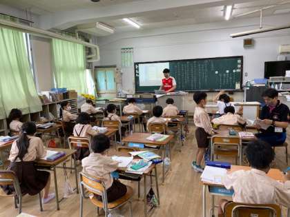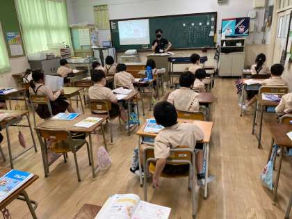 2年生1・2組の授業のようすです。どちらも算数で、プリント学習をしています。