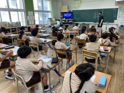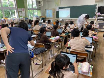 3年生1・2組の授業のようすです。1組は国語で、「自然のかくし絵」のテストをしています。2組は理科で、TEAMSを使って課題をしています。