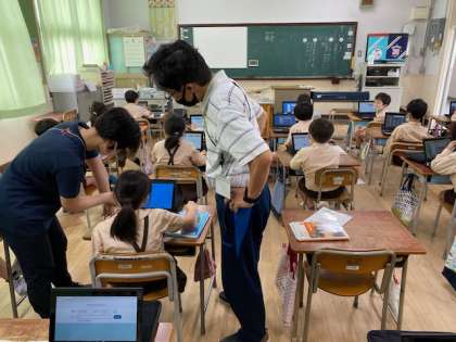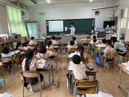2年生1・2組の授業のようすです。どちらも国語で、1組は「かんさつしたことをかこう」の学習を、2組はタブレットで自習をしています。