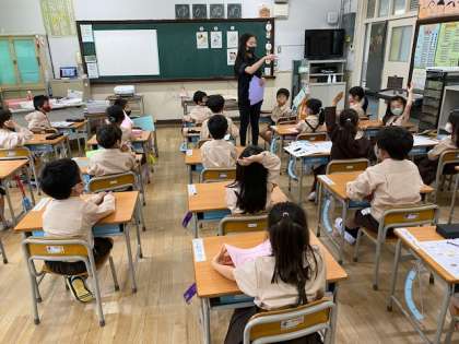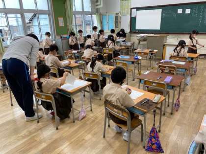 1年生1・2組の授業のようすです。1組は国語で、「とんぼ」に関する短い文を書いて点検を受けています。2組は図工で、色画用紙を配付してもらっています。