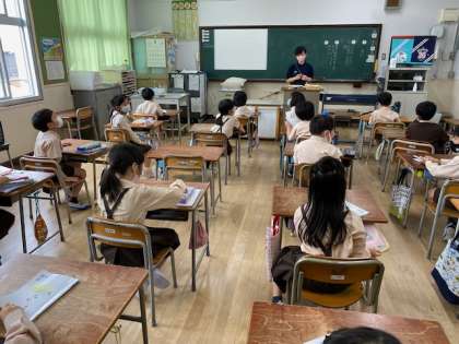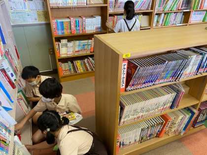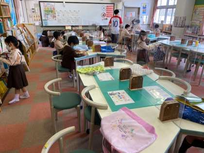2年生1・2組の授業のようすです。1組は図書館で本を読んでいます。2組は国語で、教科書を読んでいます。