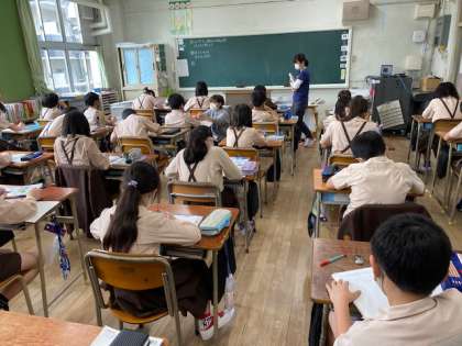 5年生1・2組の授業のようすです。どちらも算数で、「小数のかけ算」の学習をしています。