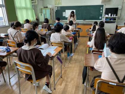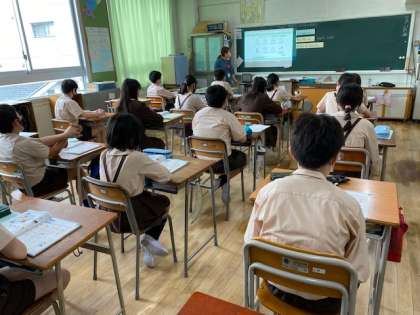 6年生1・2組の授業のようすです。1組は英語で、「得意なことを伝え合おう」という目標で、「I'm good at〜」「Nice/Me.too」「Oh.You are good at 〜」の文の練習をしています。2組は社会で、「内閣の働き」の学習をしています。