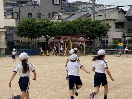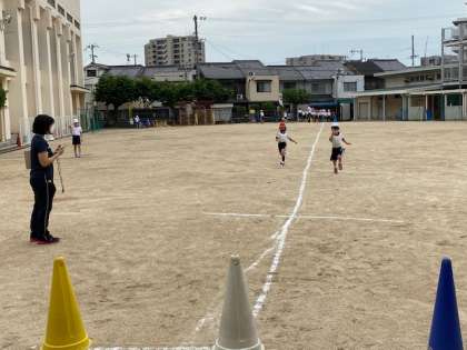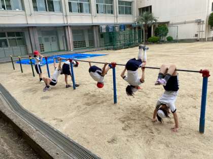 3年生1・2組の授業のようすです。合同体育で、鉄棒やうんてい・ろくぼくなどの運動をさせながら、50m走の練習をしています。