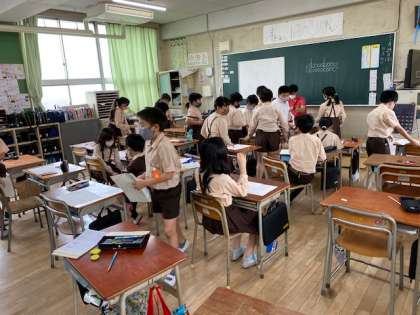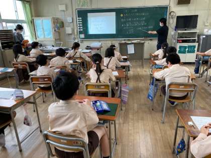 4年生1・2組の授業のようすです。どちらも算数で、「工夫して大きな数の計算をしよう」ということで、1億を超えるの計算に取り組んでいます。