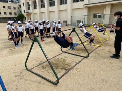 4年生1・2組の授業のようすです。1組は図工で、「コロコロガーレ」というキットを作っています。2組は体育で、「逆あがり」の練習をしています。