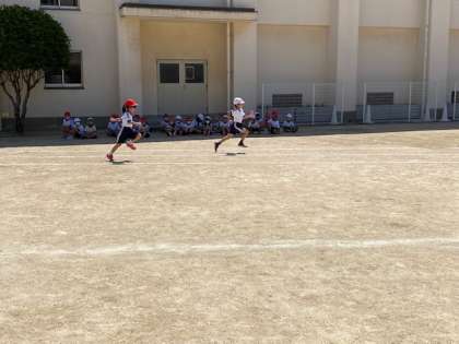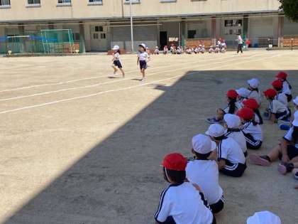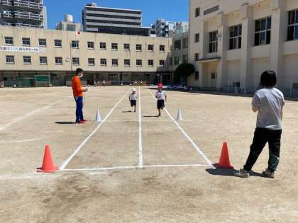 1年生1・2組の授業のようすです。合同体育で、スポーツテストの「50m走」のタイムを計っています。