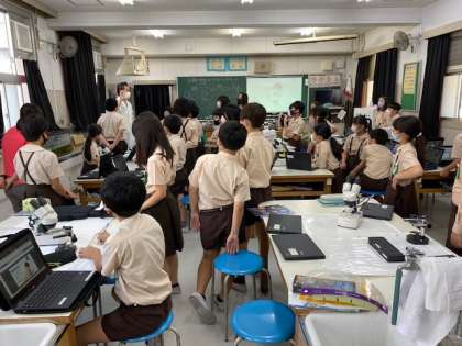 5年生1・2組の授業のようすです。1組は英語で、「教科書の街の図の中からアルファベットをさがす」競争をしています。2組は理科で、「解剖顕微鏡」や「双眼実体顕微鏡」を使って、小さな生物等を観る練習をしています。