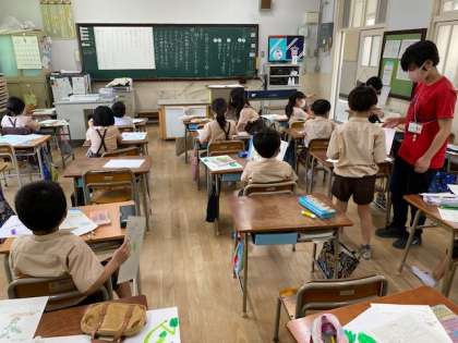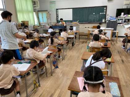 2年生1・2組の授業のようすです。1組は音楽で、フェイスシールドをつけて、オルガンに合わせて小さな声で歌っています。2組は生活科で、先日植えたサツマイモのスケッチ等をしています。