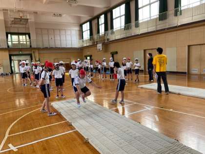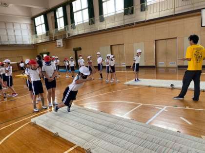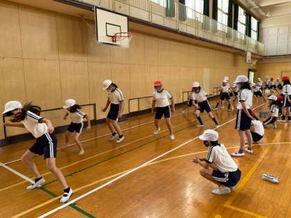 5年生1・2組の授業のようすです。合同体育で、スポーツテストの「反復横跳び」や「立ち幅跳び」の練習を行ってから、正式に計測を行っています。