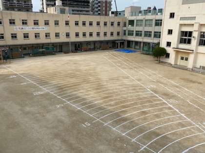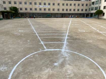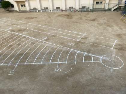 本日放課後、職員作業でスポーツテストの「ソフトボール投げ」のライン引きを行いました。