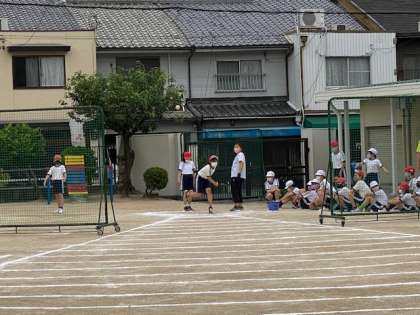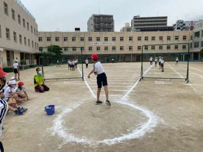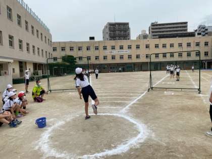 6時間目、6年生1組の「ソフトボール投げ」のようすです。