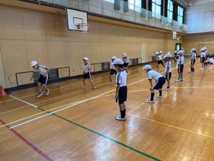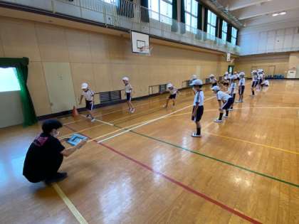 4年生1・2組の授業のようすです。1組は図工で、「コロコロガーレ」というキットを作っています。2組は体育で、スポーツテストの「反復横跳び」の回数計測を2人ずつの組でしています。