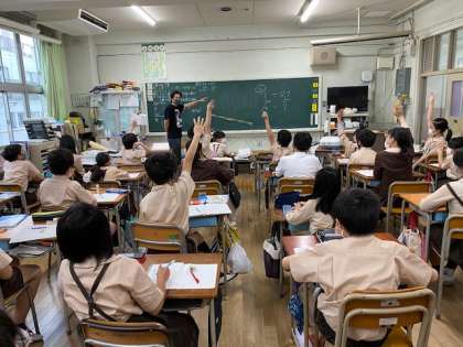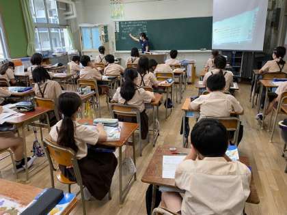 5年生1・2組の授業のようすです。どちらも算数で、「小数のわり算」に取り組んでいます。