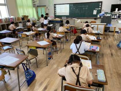 2年生1・2組の授業のようすです。どちらも算数で、「繰り下がりのある引き算のひっ算」等の練習問題をしています。