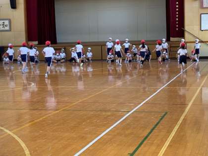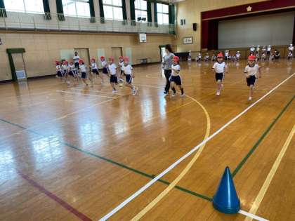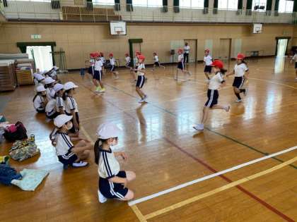 3年生1・2組の授業のようすです。合同体育で、スポーツテストの「シャトルラン(往復持久走)」の記録をとっています。