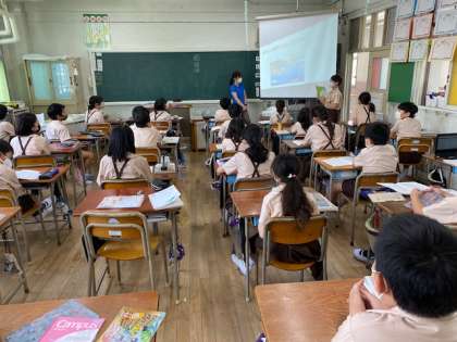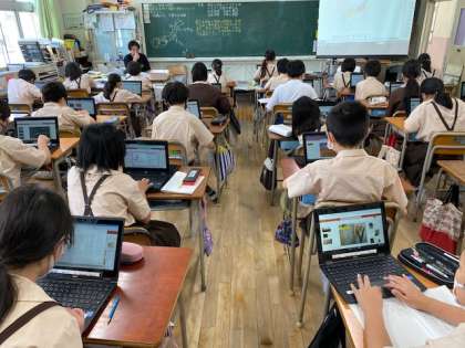 5年生1・2組の授業のようすです。どちらも国語で、「海洋ゴミ問題」についてタブレット端末を使って調べてまとめをしています。2組は調べたことを発表しています。